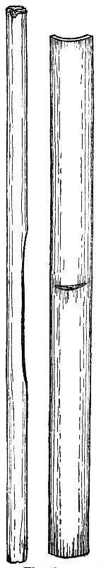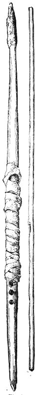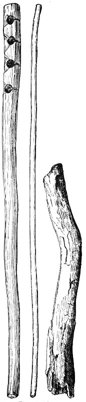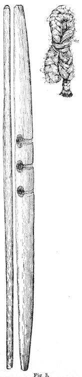 Fire is easily procured with this set. It takes but a slight effort to cause a wreath of aromatic smoke to curl up, and the friction easily grinds off a dark powder, which collects between the edges of the slot. When this ignites it drops down the slot in a little pellet, and falls upon the tinder placed below to receive it. Both drill and hearth are 18 inches long.
