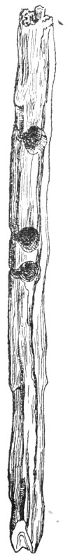 A piece of very hard and coarse, rough-grained wood, perhaps 8 inches in length, 2 in width, and three-fourths of an inch in thickness is procured. In one side of this and near one edge several holes are made, about one-half an inch in diameter by five-eighths of an inch in depth, rounded at the bottom, but left somewhat rough or very slightly corrugated. In the edge nearest these holes a corresponding number of smaller and tapering holes are made, opening by a small orifice into the bottom of each of the larger ones. These are made very smooth.