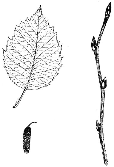 Twigs: At first green and hairy, later brownish, smooth; zigzag. Buds cone-like with a single smooth, reddish brown scale.