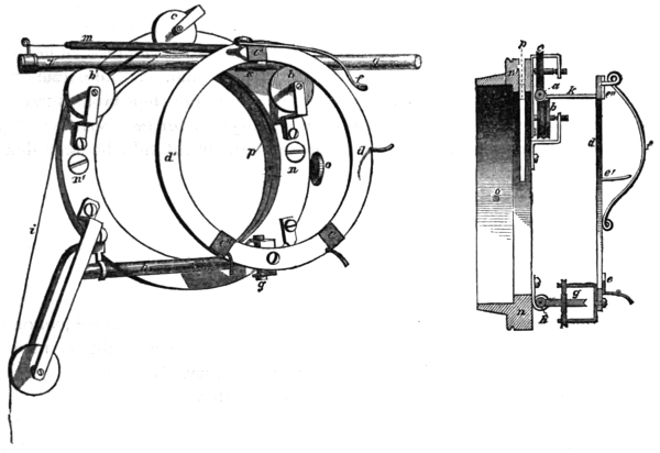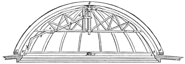 The arch can be set across the observatory in any direction, north and south, east and west, or at any intermediate position, because the abutments where the ends rest, are formed by a ring l l′ l″, fastened round the circular aperture, through the stationary part of the roof.