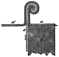 When the telescope is not in use, and the dome is let down, so that there is no longer an interval of a quarter of an inch between it and the rest of the roof, it is confined inside by four clamps and wedges. Otherwise, owing to its lightness, it would be liable to be blown away. These clamps a, Fig. 41, are three sides of a square, made of iron one inch square. They catch above by a point in the wooden basis-circle of the dome b, and below are tightened by the wedge c.