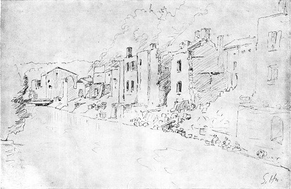 Je weiter wir vorkamen, desto häufiger schienen die Explosionen zu werden. Da trafen wir einen Offizier, der uns mitteilte, die österreichische Batterie sei nicht in Tätigkeit, und weiterzugehen sei mehr als gefährlich. Wahrscheinlich hatte man durch Flieger die Kolonne festgestellt und sie zum Ziel für das Feuer mehrerer[S. 166] Batterien genommen. Das häßliche Pfeifen durchschnitt die Luft, man schoß sich auf die Mörser und ihre Wagen ein. Wir hielten es daher für das klügste, diese gefährliche Stelle zu verlassen.