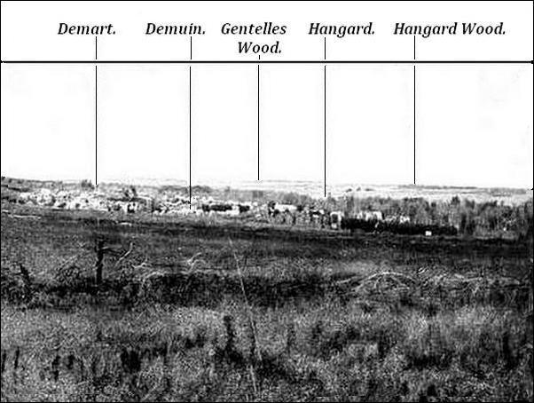 The Picardian Plain, with its broad and gentle undulations, dotted here and there with small woods, is closed, on the south, near the valley of the Oise, by the wooded hills of Genlis, Frières and La Cave, and to the west of the bend in the Oise, by the hills of Porquericourt and the wooded massif of Le Plémont, with its promontory, Mount Renaud, to the south of Noyon. Further west, the high ground of Boulogne-la-Grasse does not close the Plain of Santerre, which, between the slopes of Le Plémont and Montdidier, communicates freely with the Plain of Ile-de-France. The enclosed and wooded valleys of the rivers Avre, Trois-Doms and Luce intersect the tablelands of Santerre. Further north, stretches the old battlefield of 1916,—a chaotic waste of winding trenches and barbed wire entanglements.