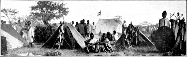 Um 5½ Uhr Reveille, um 6 Uhr abmarschiert. Da ich nicht ganz wohl war, mußte ich mich tragen lassen, ganz wie eine orientalische Fürstin: Großartige Sänfte mit Sonnendach und vier Träger, die zwei und zwei abwechselnd trugen, den Dolmetscher und einen Boy zur Seite, drei Stunden marschiert. Am Lagerplatz angelangt, sah ich von meinem Lehnstuhl aus dem Aufschlagen der Zelte zu: ein Schlafzelt und ein anderes zum Aufenthalt[S. 9] während des Tages. Unser Koch fängt an, mir zu imponieren. Es gab Huhn in afrikanischer Zubereitung. Unsere Leibgarde macht mir Spaß. Fünf Bengels in Khakianzug, kurzen Hosen, mit roten Aufschlägen und Achselstücken, unseren Reserve-Tropenhelmen und Toms Mützen. Die beiden kleinsten sehen aus wie schwarze Amoretten, und wenn sie auf dem Marsche hin- und herlaufen, ist es eine Freude, zuzusehen.
