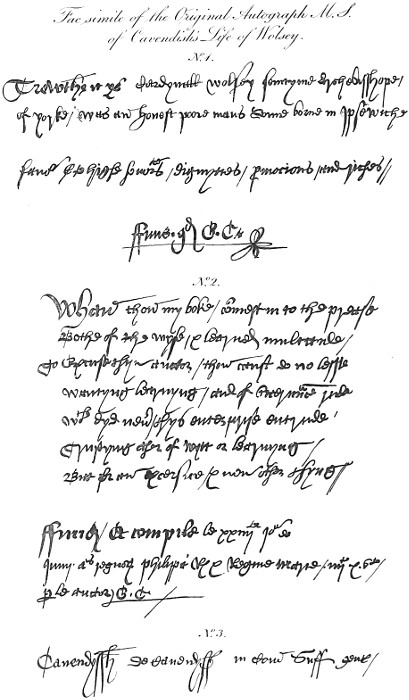 The fate of this Life of Wolsey has been indeed singularly unfortunate; after remaining in manuscript nearly a century, it was first printed in 1641, for party purposes, but in such a garbled form as to be hardly recognized for the same work, abridgment and interpolation having been used with an unsparing hand. Its author too had been robbed of his literary honours, which were bestowed upon his younger [xii] and more fortunate brother Sir William Cavendish, until the year 1814, when his cause was ably advocated in a Dissertation by the Rev. Joseph Hunter, F.A.S. author of the History of Hallamshire. I am indebted to the kind intervention of my friend J. H. Markland, Esq. for the privilege of reprinting that Dissertation, which the reader will find at the commencement of the volume, and will, I doubt not, be gratified in the perusal. It affords the best example of clear argumentative solution of a literary paradox from circumstantial evidence with which I am acquainted, at the same time it is so skilfully interwoven with curious matter bearing upon the question, as not only to divest it of the sterile character with which disquisitions of the same kind from less able hands have been marked, but to render it very interesting. I owe Mr. Hunter my best acknowledgements for the ready manner in which the favour was conferred, and I look to have the thanks of those, who are yet unacquainted with it, for uniting this tract with the work of George Cavendish, from[xiii] which it should never again be disjoined. For all that relates to the Life of Wolsey and its author, therefore, I shall beg leave to refer to this source of information; and it will only remain for me to give an account of the present edition.