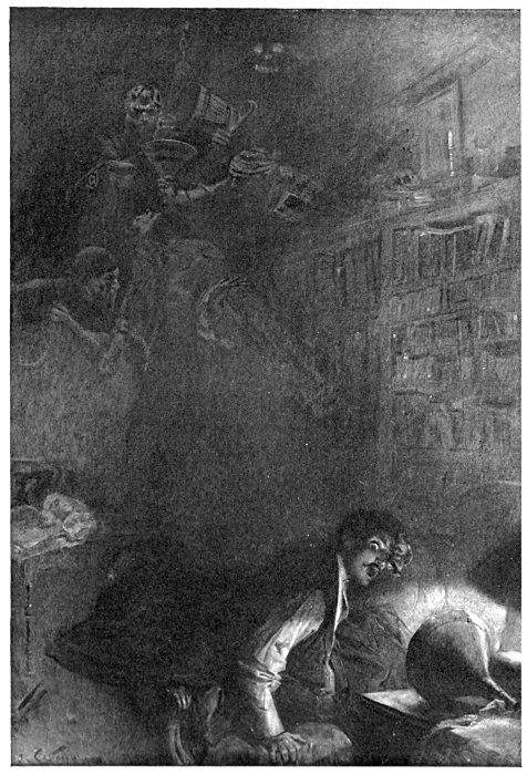 My heart sank within me as I saw these ominous preparations, and yet I was held by the fascination of horror, and I could not take my eyes from the strange 12spectacle. A man had entered the room with a bucket of water in either hand. Another followed with a third bucket. They were laid beside the wooden horse. The second man had a wooden dipper—a bowl with a straight handle—in his other hand. This he gave to the man in black. At the same moment one of the varlets approached with a dark object in his hand, which even in my dream filled me with a vague feeling of familiarity. It was a leathern filler. With horrible energy he thrust it—but I could stand no more. My hair stood on end with horror. I writhed, I struggled, I broke through the bonds of sleep, and I burst with a shriek into my own life, and found myself lying shivering with terror in the huge library, with the moonlight flooding through the window and throwing strange silver and black traceries upon the opposite wall. Oh, what a blessed relief to feel that I was back in the nineteenth century—back out of that medieval vault into a world where men had human hearts within their bosoms. I sat up on my couch, trembling in every limb, my mind divided between thankfulness and horror. To think that such things were ever done—that they could be done without God striking the villains dead. Was it all a fantasy, or did it really stand for something which had happened in the black, cruel days of the world’s history? I sank my throbbing head upon my shaking hands. And then, suddenly, my heart seemed to stand still in my bosom, and I could not even scream, so great was my terror. Something was advancing toward me through the darkness of the room.
