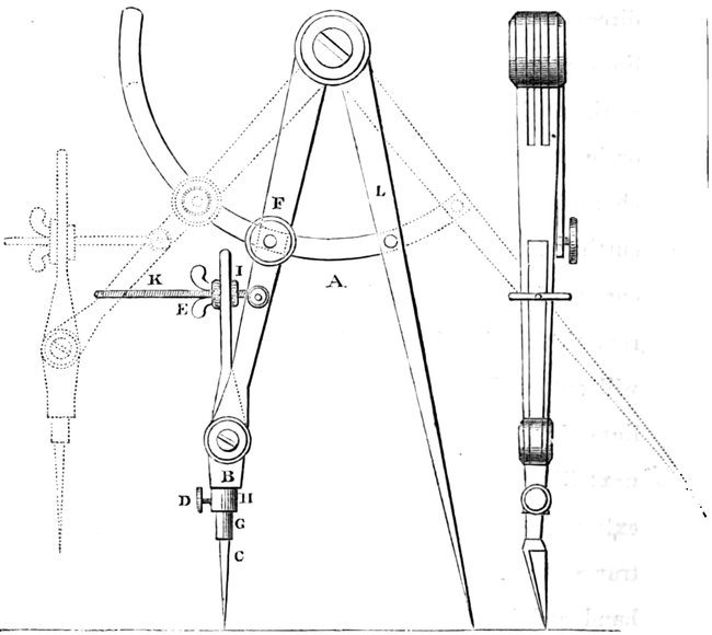 This instrument will be found particularly useful in cutting the necessary mitres for joining together the edges of the work, or for any other 32work of similar description, such as the copings to walls, mouldings of every description, &c., &c. Having now described these very important instruments in a way we hope may prove perfectly intelligible, we proceed to state the requirements in those necessary ones, knives. The number of these the artist will use, is regulated more by his own fancy than anything else; but there are three shapes he will find absolutely necessary. In modelling, as in painting, there are numerous tricks and contrivances for producing various effects; and as the painter will often value a bit of old scrubby, worn-down brush, so the modeller will find various cutting instruments materially assist him, such as the broken blade of a knife, a steel pen, a bradawl, &c., &c., many of these producing effects that more elaborate instruments would have failed doing. On page 33 will be found an engraving representing three requisite varieties of knives. No. 1. This knife is 35long in the blade, and, as will be found in all the others, is perfectly straight on the cutting edge; this knife is used to cut straight lines in all directions through strong work, cutting oblique lines, mitres, splays, &c. No. 2. One for lighter work used in forming or modelling ornaments, or, in general, cutting work of a lighter and neater character. No. 3. This blade is used solely for cutting all descriptions of circular work, and curves of every description. It may be useful to remark that this is the only shape of blade that will cut, with clearness and sharpness, curved lines through thick cardboard. The instrument next illustrated is called a knife compass, and is extremely valuable for cutting out circular architraves, &c., &c., doing its work in a way that the hand and knife could not equal, and with the least possible trouble. See illustration, page 36. They resemble, in some respects, an ordinary pair of compasses, but of a little stronger make than 36the common. A is a moveable sweep of brass, to regulate the opening of the legs of the compasses, which, being opened to the requisite width, are firmly held by tightening the thumb-screw, F. B, the moveable leg to which the cutting-knife C is attached by means of a shoulder to the blade at G, and a socket at H, into which it fixes, and is secured by the screw at D. E and I are two screws working on the rod, K, on each side of the moveable bar, B.