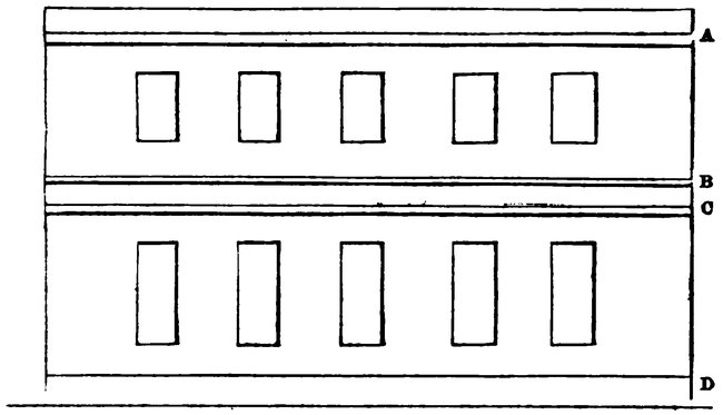 79These are then to be affixed in their places, as shown upon the drawing, some in thicker, others in thinner paper. A ledge of cardboard must be left at the back of the blocking, and also on the same level against the side of the house; this will be for the purpose of resting the roof upon.[5] The cornice will be constructed in the manner described for the others; the pieces on the frieze C, C, C (page 73) will be placed on the required thickness for the return, but the return of the cornice must be cut in it. The plinth must now be moulded, cut, and fixed; and the whole is complete.