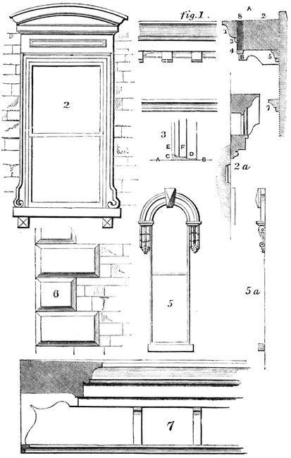 No. 1 Fillet. No. 2 Cyma recta. No. 3 Fillet. No. 4 Casetto. No. 5 Facia. No. 6 Continuation of facia. No. 7 Bed mould.