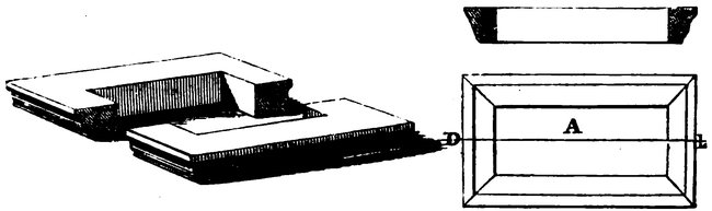 The next object we would call attention to is 75the Greenhouse, page 73, and state that there are two ways of modelling this very general appendage to a modern mansion. The first and the simplest method is to form the backing of blue paper behind the mica. The other, by doing away with the blue backing, and allowing the mica to remain transparent. The former method saves some amount of labour; but the latter being in our opinion the best and most artistic method, we shall proceed to describe it: First form the pilasters (you will require double the number than for the opaque backing), and cut them in their length from A to B (see elevation, page 73), from the commencement of the base mouldings to the underside of those of the cap. The way of proceeding in modelling cap and base will be readily understood from the accompanying sketch, where it will at once be seen better than we can describe. The best way to cut them is as if they were a window or opening, cutting the piece out of the centre at A, after having moulded 76the edge all round. Then dividing them into two along the line D L as below, fix them in their respective places. The angle ones must be double, to avoid having to mitre them. A piece of mica or thin glass cut to the size of the one side is now taken, and the pilasters and other portions, divisional bars, &c., are gummed to it, on both sides; and when with the end it is finished, let it occupy its intended position on the outline plan.