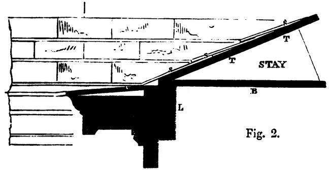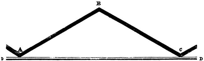 Sections must now be taken in various parts, through the roof, to ascertain the length of the respective sides. Thus if the angle A B C (see fig. 1, page 85) represents the rake of the roof, the length 87of the side will be found from A to B and B to C. The sides thus formed must be splayed to fit at the valleys, apex, &c., and at the base splayed and fixed to the top piece on which the roof plan has been drawn, observing to leave space enough all round for the gutter. If the pieces on which the sections have been drawn are cut out, they will answer for internal stays to the roof.