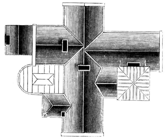 The roof plan is given upon page 85, fig. 3, as also an outline section for the finishing of the roof, fig. 2, page 85; it will explain itself. The lead flat will be formed by the bottom piece, but it must be covered by a paper resembling in tint that of the lead itself. When the groundwork of the roof is completed, it must be covered in imitation of slates by one or other of the previously-mentioned methods. We will, however, describe both, leaving the reader to use his own judgment as to which he may adopt, our preference being for the strips of overlapping 88paper. In the simple scoring, proceed to cut out of the slate tinted paper pieces accurately fitting to the groundwork of the roof, then with the knife handle score these sides along, as you would ink in the roof lines in a drawing, closer at the ridge, becoming wider at the base, and parallel to each other. The latter by cutting layers of paper, gauged decreasing in size as before directed, fixing them to the groundwork of the roof beginning at the base, and overlapping them about 1⁄16th of an inch; after all, submitting to the press. The roof assumed to be finished, affix the chimneys, generally make good all imperfections, &c., and the model is ready for removal to its final destination; cut therefore the paper it was built upon from the board, and also tear from the bottom edges the paper that may have adhered to it, holding it by the wood stay.