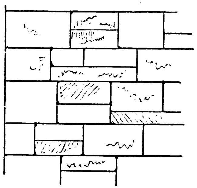 Ashlar.—In representing work of two kinds, namely, quoins of dressed work, and filling in of random tooled ashlar:—Draw the quoins in with a H H H pencil, score in the ashlar, and tint as may be desired.