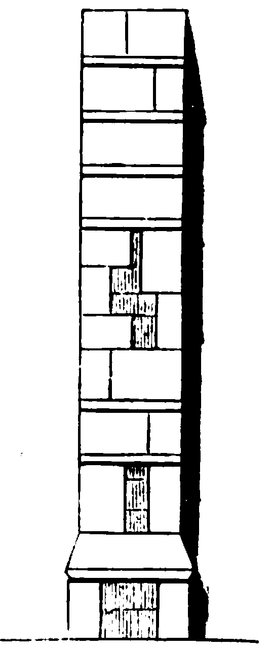 Commence the preparation of the quoins (fig. 6, p. 61) by cutting pieces the required thickness and width of both long and short quoins, and in long strips, with the height of each one marked up its length previously by the dividers.[3] Cut first the 65requisite splay at the edge of the quoin, along the whole length both sides. Cut where marked for height, and splay top and bottom. They are then finished, and may be at once fastened to the work.