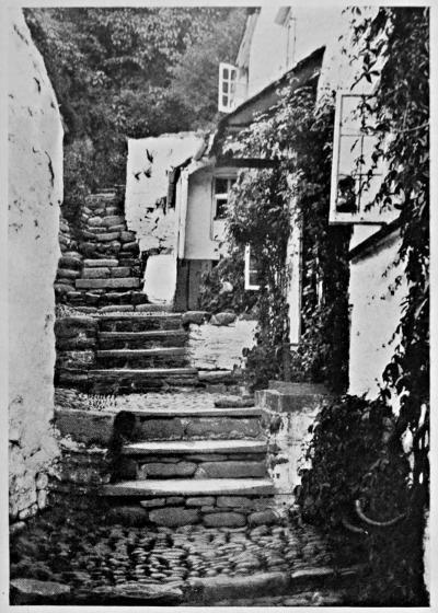 “Now that you have seen Clovelly,” said Kingsley to his wife, “you know what was the inspiration of my life before I met you.” Here on the little quay he heard his father, the rector, many a time read prayers for the fishermen before they put to sea; and it was the sad teaching of Clovelly, where he saw so many men work and so[180] many women weep, that gave its pathos to the song of the Three Fishers. When his health was failing, it was the air of Clovelly that he pined for. He came to lodgings at the top of this winding street that we climb so laboriously, “the narrow, paved cranny of a street,” as he called it, and stayed there happily for weeks.