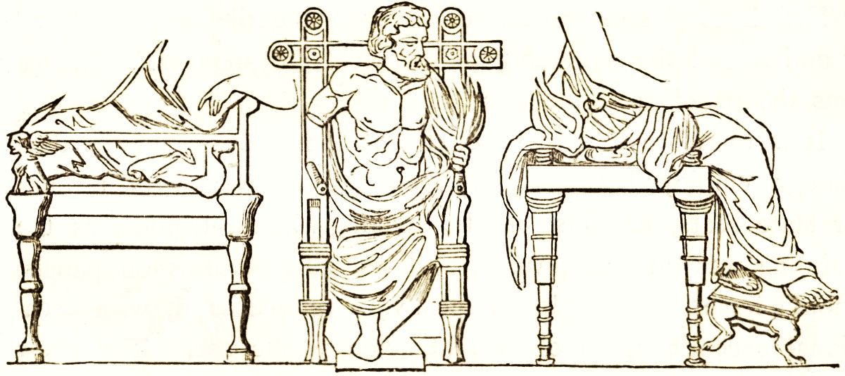 The tables seem in general to have been of similar form and decoration to the thrones or seats, the ends of the frame projecting and carved as in the woodcut above, only on a larger scale. The couches were of similar form, but made of gold and silver, stuffed and covered on the surface with the richest materials. The tables and the chairs were often made in the shape also found in Greece and Rome, with folding supports that open on a central rivet like our camp-stools, and like the curule chairs which were common not only in Rome but throughout Italy during the renaissance.