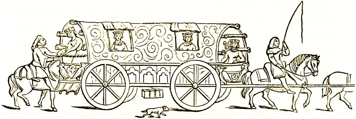 We know but little of the period succeeding the destruction of Rome and the extinction of classic customs. In the middle ages we find carts, like those now in use for agricultural purposes in France; a long frame with spreading rails balanced on one pair of wheels of large dimensions, drawn by a string of horses. The woodcut of a family carriage is from the well-known Luttrell psalter, an illuminated manuscript of the early fourteenth century. Such vehicles seem to have been clumsy enough and had no springs: nevertheless they were much ornamented with various decorations. They had roofs as a protection from the weather, with silk or leather curtains; and the interior was fitted with cushions. In the "Squire of low degree" the father of the princess of Hungary promises,