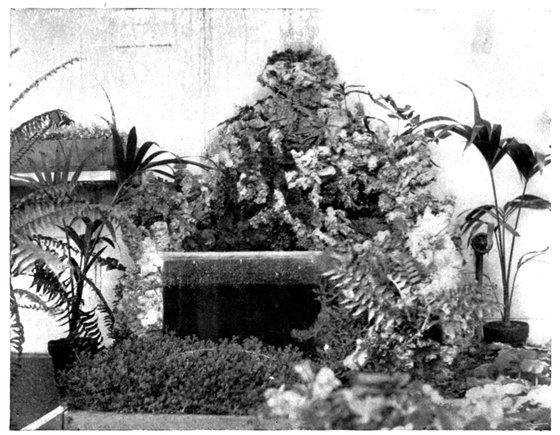 An excellent place for Begonias, Gloxinias, and other shade-loving plants is made by fitting a wide 246shelf under a north or east window on the outside, with a raised edge three or four inches high, made by tacking strips of wood across the front and ends. Inclose with window-netting, first nailing strips of wood from the outer corners of the shelf to the upper corners of the window-casing to support the netting. When the shelf is filled with wet sand, and the plants plunged in it, one has a miniature greenhouse accessible from the room, and safe from trespass of chickens, cats, or careless feet. The shelf may extend considerably beyond the window-casing if desired, and be made attractive from the outside by climbing vines. The Maurandya is fine here, as it will push its tips through the netting, and be very ornamental; the Asparagus tenuissimus and A. plumosus nanus are also good. A couple of plant-brackets fastened to the outside casing will afford room for drooping plants, and add to the attractiveness of the shelf. Primroses will bloom here all summer, and Ferns, Gloxinias, and fancy-leaved Caladiums find a congenial home.
