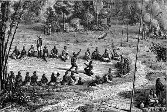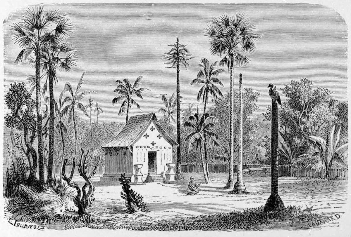 Their Laotian friend informed our travellers that they were witnessing nothing less than a funeral ceremony! In Laos, cremation is the universal custom; and the mortuary rites of a Laotian of rank generally terminate with a gladiatorial combat, at the conclusion and on the very site of the process of cremation.