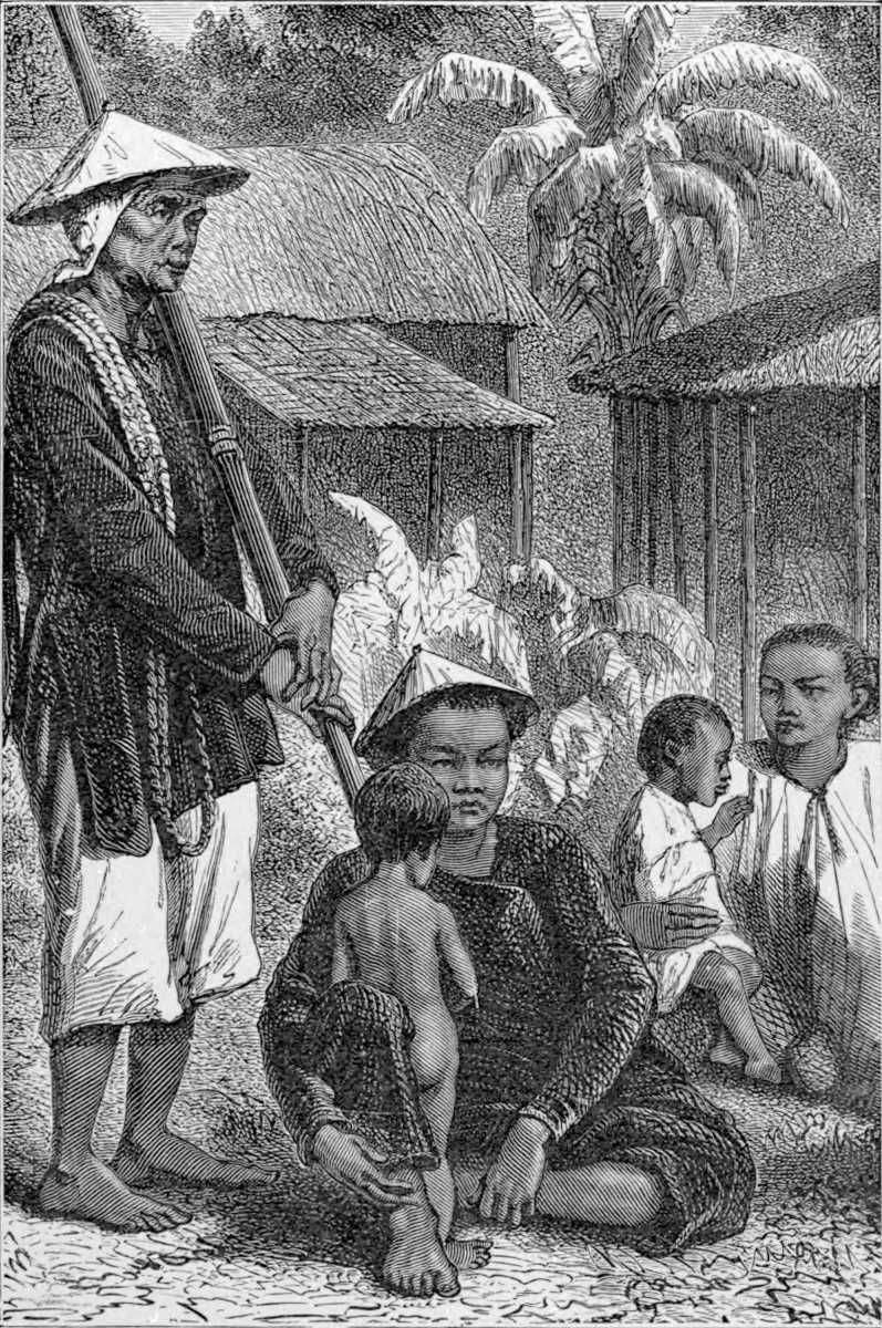 Lieutenant Garnier describes the Laotians as generally well made and robust. Their physiognomy, he says, is characterized by a singular combination of cunning and apathy, benevolence and timorousness. Their eyes are less regular, their cheeks less prominent, the nose straighter, than is the case with other peoples of Mongolian origin; and but for their much paler complexion, which closely approaches that of the Chinese, we should be tempted to credit them with a considerable admixture of Hindu blood. The male Laotian shaves his head, and, like the Siamese, preserves only a small tuft of very short hair on the summit. LAOTIAN COSTUME. He dresses himself tastefully, and can wear the finest stuffs with ease and dignity. He chooses always the liveliest colours; and the effect of a group of Laotians, with the brilliant hues of their costume set off by their copper-tinted skin, is very striking. The common people wear an exceedingly simple garb—the langouti, a piece of cotton stuff passed between the legs and around the waist. For those of higher[18] rank the langouti is of silk; and is frequently accompanied by a small vest buttoned over the chest, with very narrow sleeves, and another piece of silk folded round the waist as a girdle, or round the neck as a scarf. Head-gear and foot-gear are things little used in Laos; but the labourers and boatmen, when working or rowing under a burning sun, protect the head with an immense straw hat, almost flat, much like a parasol. Personages of high rank, when they are in “full dress,” wear a kind of slipper, which appears to inconvenience them greatly, and is thrown off at the earliest opportunity.