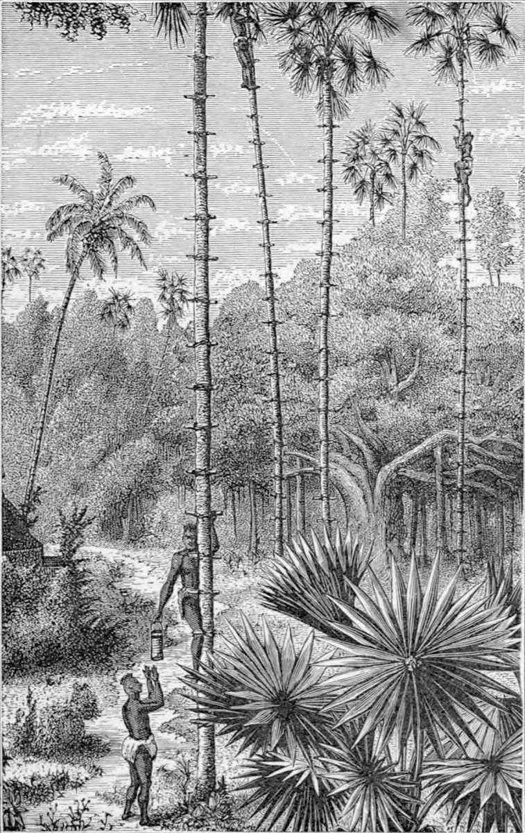 A day or two afterwards, Garnier and his friends, in returning from a walk in the environs of Lakon, encountered some Laotians carrying vessels of bamboo, filled with a liquid which at first they supposed to be water. On tasting it, however, they discovered that it was the wine of the country; sweet-flavoured, and by no means disagreeable to the palate; not unlike, indeed, the product of some of the Rhenish vineyards. It was palm-wine, freshly made; and to enjoy its bouquet and full flavour it should be drunk in this condition, for it will not keep more than four-and-twenty hours without fermentation. The Laotians offered to conduct the strangers to a neighbouring plantation, where they might observe the different processes of its manufacture. The offer was accepted, and the party soon[58] arrived at a clearing which was thickly planted with great borassus palms. HOW THE WINE IS COLLECTED. To collect the wine,—which is, in fact, the sap of the tree,—nothing more is necessary than to make an incision in the middle of the head of the tree, at the point where the leaves branch off, and suspend beneath a bamboo, into which the sap falls, drop by drop. In order to reach the summit of these huge palms, which are straight and smooth as the main-mast of a ship, the Laotians have invented a simple and ingenious process. They transform the palm into a veritable ladder, by attaching to the trunk, with small strips of flexible ratan, projecting laths of bamboo, which, jutting out to right and left at intervals of twelve to fourteen inches, form so many “rungs,” and enable the ascent of the tree to be rapidly and easily accomplished.