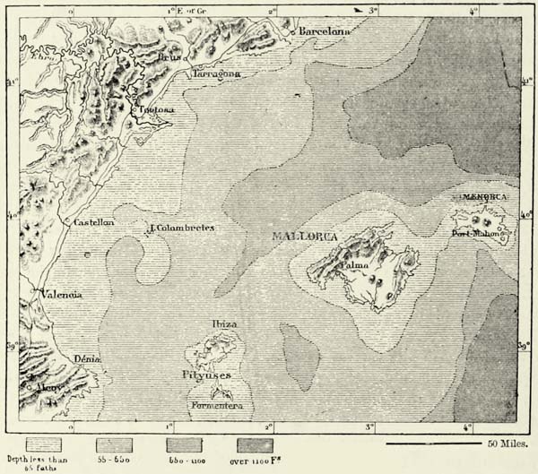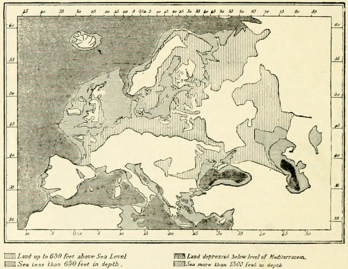 There can be no doubt that vast changes have taken place in the configuration {9} of Europe, not only during more ancient geological periods, but also within comparatively recent times. We have already seen that a vast arm of the sea formerly separated Europe from Asia; it is equally certain that there was a time when it was joined to Anatolia by an isthmus, which has since been converted into the Bosphorus of Constantinople; Spain was joined to Africa until the waters of the Atlantic invaded the Mediterranean; Sicily was probably connected with Mauritania; and the British Islands once formed a portion of the mainland. The erosion of the sea, as well as upheavals and subsidences of land, has effected, and still effect, changes in the contours of our coasts. Numerous soundings in the seas washing Western Europe have revealed the existence of a submarine plateau, which, from a geological point of view, must be looked upon as forming an integral portion of our continent. Bounded by abyssal depths of thousands of fathoms, and submerged one hundred fathoms at most below the waters of the ocean, this pedestal of France and the British Islands must be looked upon as the foundation of an ancient continent, destroyed by the incessant action of the waves. If the shallow portions of the ocean, as well as those of the Mediterranean Sea, were to be added to Europe, its area would be increased to the extent of one-fourth, but it would lose, at the same time, that wealth in peninsulas which has secured to Europe its historical superiority over the other continents.