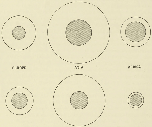 The shaded circles represent the various continents; the outer circle represents the actual extent of coast-line. The blank space between the two concentric circles represents graphically the difference between the smallest possible or geometrical contour of a country having the area of the respective continents, and the actual contour as exhibited in the existing coast-lines. Europe, being in reality only a peninsula of Asia, hardly admits of this comparison.