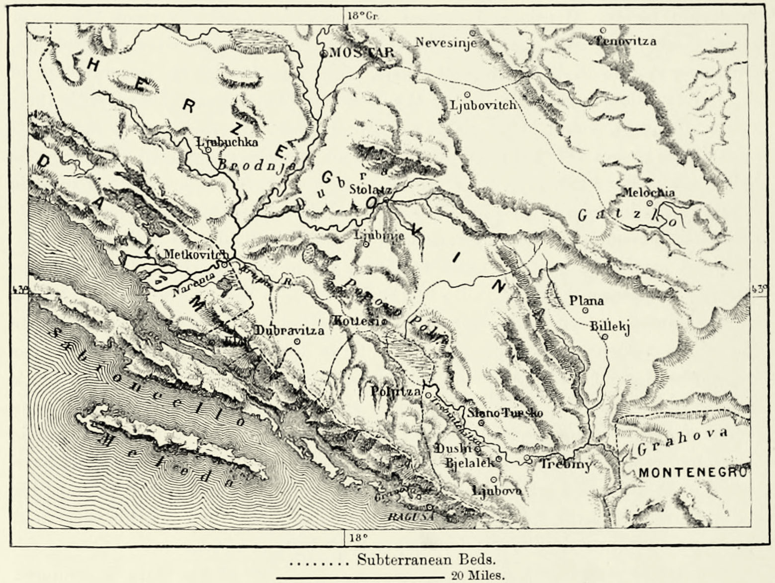 The configuration of the Alps, and of the labyrinthine mountain ranges branching off from them towards the east, could not fail to exercise a most powerful influence upon the history of Europe and of the entire world. The only high-roads known to barbarians are those traced out by nature herself, and they were consequently able to penetrate into Europe only by sea, or through the vast plains of the north. Having penetrated to the westward of the Black Sea, their progress was first stopped by the lakes and difficult swamps of the Danubian valley; and, when they had surmounted these obstacles, they found themselves face to face with a barrier of high mountains, whose intricate wooded valleys and declivities led up to the inaccessible regions of eternal snow. The Alps, the Balkan, and all the other advanced chains of the Alpine system constituted an advanced defensive barrier for Western Europe, and the conquering nomad tribes who threw themselves against it did so at the risk of destruction. Accustomed to the boundless horizon of the steppes, they did not venture to climb these steep hills—they turned to the northward, where the vast plains of Germania enabled successive swarms of immigrants to spread over the country with greater ease. And as to the invaders, whom blind rage of conquest impelled to engage in the defiles of these mountains, they found themselves caught as in a trap; and this accounts for the variety of nations, and of fragments of nations, whose presence has converted the countries of the Danube into a sort of ethnological chaos. And as the débris carried along by the current is deposited in the eddy of a river, so were these fragments of nearly every nation of the East accumulated in motley disorder in this corner of the Continent.