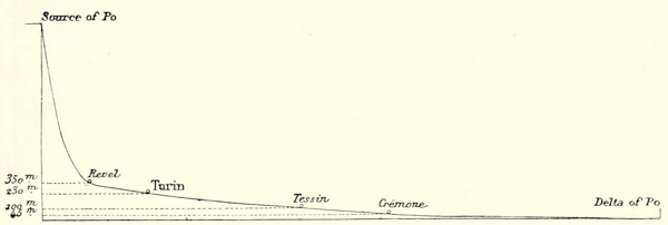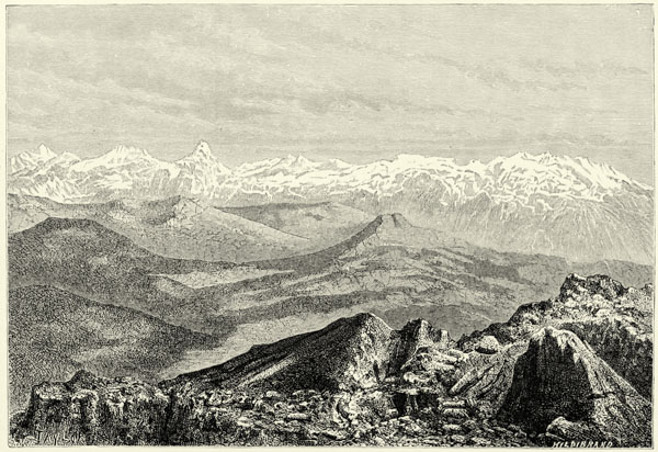 The Alps, whose ancient Celtic name probably refers to the whiteness of their snowy summits, stretch in an immense curve, more than 600 miles in length, from the shores of the Mediterranean to the plains of the Danube. They consist in reality of more than thirty mountain masses, representing as many geological groups, and joined to each other by elevated passes; but their rocks, whether they be granite, slate, sandstone, or limestone, form one continuous rampart rising above the plains. In former ages the Alps were higher than they are now. This is proved by an examination of their detritus and of the strata disintegrated by natural agencies. But, whatever the extent of detrition, they still rise in hundreds of summits beyond the line of perennial snow, and vast rivers of ice descend from them into every upland valley. Looked at from the plains of Piedmont and Lombardy, these glaciers and snow-fields present the appearance of sparkling diadems encircling the mountain summits.