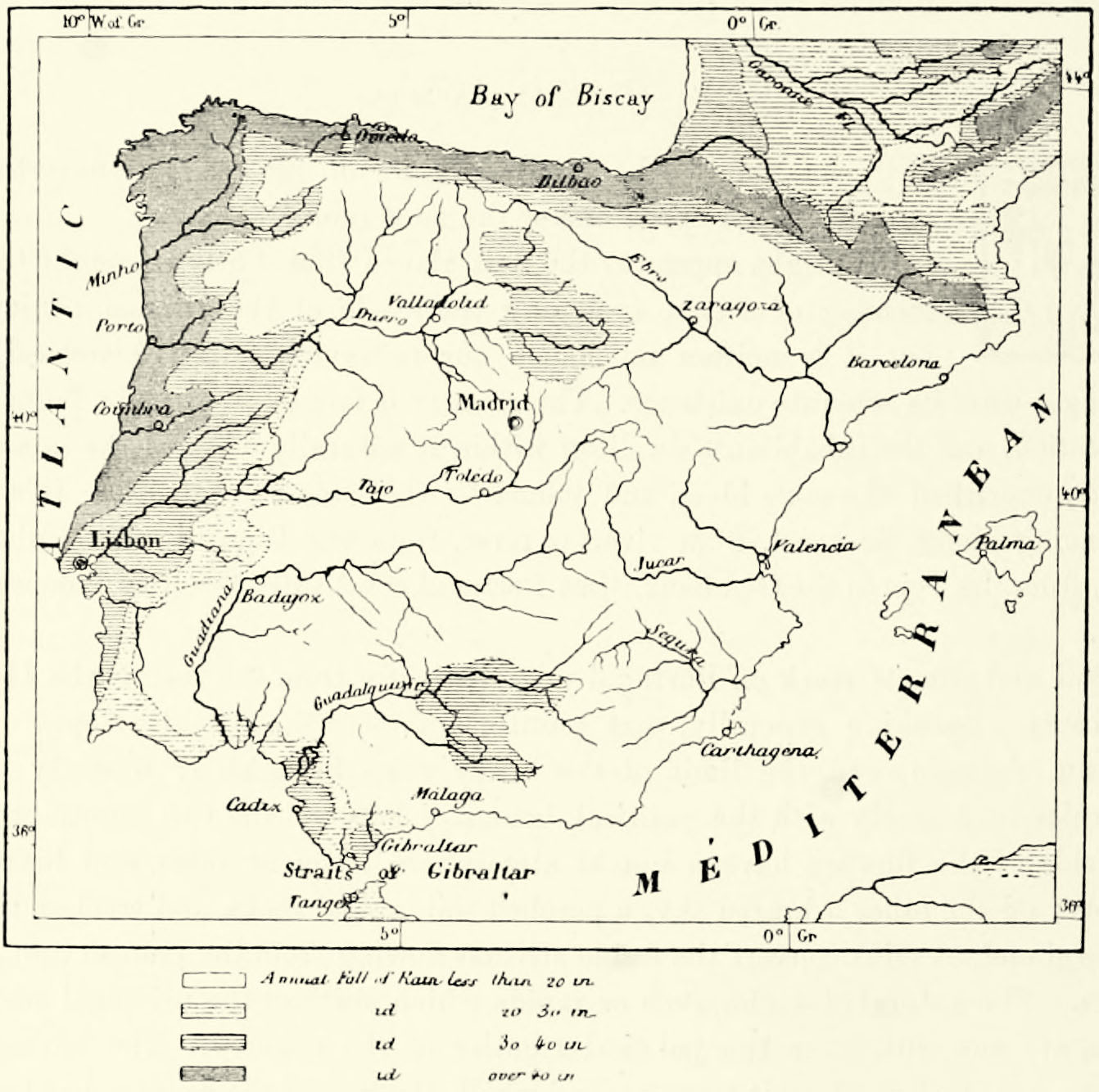 This remarkable uniformity in the climate of Europe is exhibited not only in its temperature, but likewise in the distribution of its rains. The seas washing the shores of Europe supply all parts of it with the necessary amount of moisture. There is no rainless district, nor, with the exception of a portion of the maritime region of the Caspian and a small corner of Spain, any district where droughts occasionally entail the entire loss of the harvest. Rains fall not only regularly every year, but in most countries they occur in every season, the only exception being the countries of the Mediterranean, where autumn and winter are the real rainy seasons. Moreover, in spite of the great diversity in the physical features of Europe, the amount of rain is scarcely anywhere excessive, whether it descends as a fine drizzle, as in Ireland, or in heavy showers, as in Provence and on the southern slope of the Alps. The annual rainfall scarcely ever exceeds thirty-nine inches, except on the flanks of certain mountain ranges which arrest the passage of currents charged with moisture. This uniformity and moderation in the rainfall exercise a regulating influence upon the course of the rivers, for even the smallest amongst them, at all events those to the north of the Pyrenees, the Alps, and the Balkan, flow throughout the year. They rise and fall generally within narrow limits, and inundations on a vast scale are as rare as is want of water for purposes of irrigation. In consequence of this regularity, Europe is able to derive a greater advantage from its waters than other continents where the amount of precipitation is more considerable. The Alps contribute much towards {18} maintaining a regular flow of the rivers; the excess of humidity which falls to their share is stored up in the shape of snow and ice, which descend slowly into the valleys, and melt during the heat of summer. This happens just at a time when the rivers gain least from rain, and lose most by evaporation, and some amongst them would dry up if the ice of the mountains did not come to the aid of the waters descending from the sky. It is thus that a sort of balance is established in the economy of European rivers.