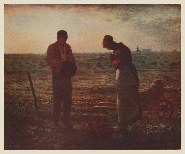 L’Angélus, c’est encore une éloquente et magnifique scène de la vie paysanne. Ils sont deux, un homme et une femme, attardés au travail de la terre, dans l’immensité morne de la plaine dorée par le couchant. Là-bas, vers l’horizon, se dresse le clocher du village, silhouette familière qui signale la place du foyer. Et voilà que, dans le soir qui tombe, les appels argentins de la cloche s’égrènent et courent au-dessus des labours. C’est l’Angélus du soir, l’heure de la prière. Et ces êtres falots, parias de la terre, redressent leur torse las, joignent les mains et courbent le front. Toute la laideur dont on affuble le paysan disparaît; le geste de ces mains jointes et de ces fronts courbés ennoblit la scène d’une grandeur sans égale, car il dit la beauté du travail librement consenti.