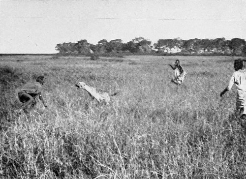 This picture, taken in the early morning, is a good instance of the way in which I have always enforced my rule as to never touching up my photographs. The plate was broken on its way home, but the cracks which resulted were left as they were.21 I remember one case in which I had put up my apparatus with a view to securing photographs of certain lions, and in which I had to be content with a picture of a spotted hyena splashing its way in full flight through the swamp. The hideous 706 cowering gait of the animal came out very strikingly on the negative.