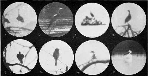 PHOTOGRAPHS OF BIRDS TAKEN WITH THE TELEPHOTO-LENS AT DISTANCES VARYING FROM 20 TO 200 PACES. 1. SPURRED GOOSE (PLECTROPTERUS GAMBENSIS, L.). 2. DARTER OR “SNAKE-NECK” (ANHINGA RUFA LACEP, Daud.). 3. GREATER CORMORANT (PHALACROCORAN LUCIDUS LUGUBRIS, Rüpp.). 4. YELLOW-FLUTED FRANCOLIN (PTERNISTES LEUCOSEPUS INFUSCATUS, Cab.). 5. A BIRD OF PREY (MELIERAN POLIOPTERUS, Cab.)(?) 6. BEE-EATER (MELITTOPHAGUS MERIDIONALIS, Sharpe). 7. SHRIKE (LANIUS CAUDATUS, Cab.). 8. PELICAN (PELICANUS RUFESCENS, Gm.).