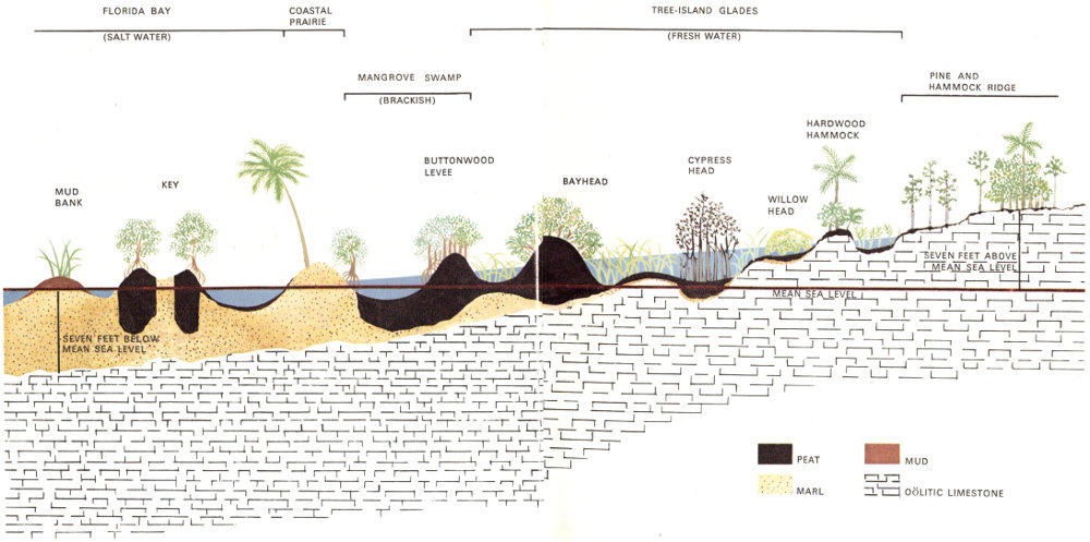 The horizontal distance represented on this diagram, from the Pineland to Florida Bay, is 15 miles. With a greatly exaggerated vertical scale, the difference between the greatest elevation of the pine ridge and the bottom of the Florida Bay marl bed is only 14 feet.