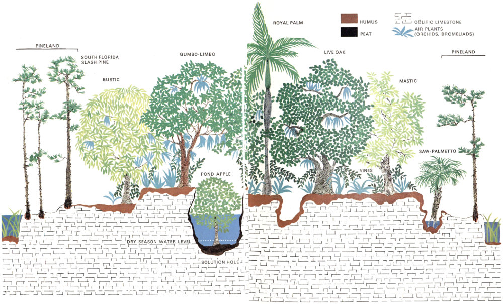 A spot in the glades where the limestone base is elevated just 2 feet will be occupied by a small forest of tropical hardwoods and palms—a 14 “hammock” much like those of the pinelands. A low spot—just a few inches below the general level of the limestone base—will remain wet even in the relatively rainless winter when the sawgrass becomes tinder dry. This sloughlike depression will support a stand of baldcypress, called a “cypress head.” Other tree islands, called bayheads and willow heads, develop in many places where soil and peat accumulate.