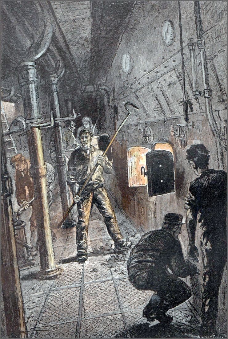 On s'aperçoit même que la flotte anglaise n'a point été oubliée, et si le yacht royal Victoria and Albert n'est pas là sous vapeur, du moins des navires sont-ils dessinés sur la vitre des fenêtres, d'où l'on est censé voir la rade de Spithead. Avec de bons yeux, sans doute, on pourrait distinguer le yacht Enchanteress, ayant à bord leurs Seigneuries les lords de l'Amirauté, tenant chacun une lunette d'une main et un porte-voix de l'autre.