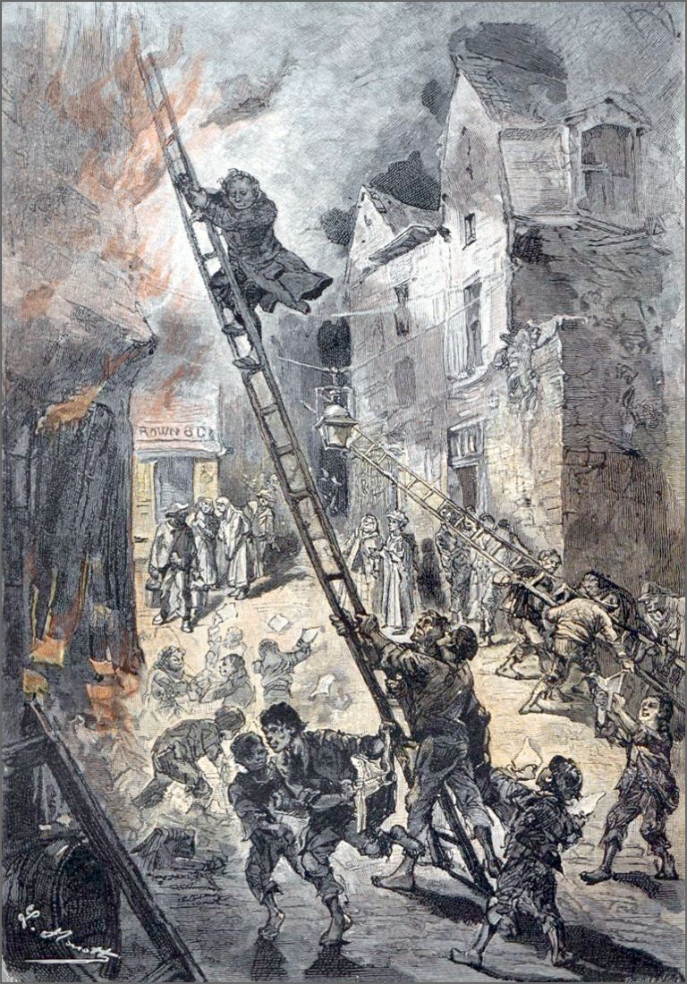 Personne ne sortait des boutiques, personne ne mettait la tête aux fenêtres. Çà et là, quelques haillons apparaissaient entre les ruelles adjacentes, et de ces haillons sortaient des faces hâves et faméliques, aux yeux rougis, profonds comme ces soupiraux à travers lesquels on voit le vide. Puis, il y avait des enfants à peu près nus, et cinq ou six de ces gamins se hasardèrent enfin à rejoindre la charrette de Thornpipe, lorsqu'elle eut fait halte sur la grande allée du mail. Et les voici tous criant: