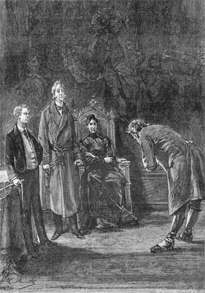 «Au fond, continue Thornpipe, vous remarquerez le trône de la reine Victoria, surmonté de son baldaquin de velours cramoisi à crépines d'or, modèle exact de celui sur lequel Sa Gracieuse Majesté prend place pendant les cérémonies de la cour.»