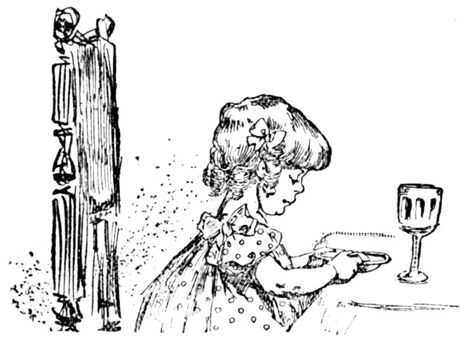 Casually, and as if unconscious that Marantha was curiosity incarnate, Philip took his own clothes-pin and adjusted it to his nose. It gave him an odd and, to Marantha, a distinguished appearance, and she inquired of him if the sensations he experienced were pleasurable. His answer expressed unconditional affirmation, and unclasping her clothes-pin Marantha snapped it vigorously over her own tip-tilted little feature. A sharp and uncompromising tweak was the result, and Marantha, shrieking, tore off the clothes-pin with a jerk that sent little Richard Willetts reeling against his neighbor. Out of the confusion—Richard was a timorous creature, 5and fully convinced that the entire kindergarten meditated continual assault upon his small person—rose the chiding voice of Marantha: