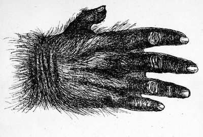 The hands are intended to illustrate the close resemblance between the hand of a gorilla and that of a man belonging to the Hammeghs of the Nubian Soudan. It will be observed that while the fingers of the gorilla are webbed, the second and third fingers of the man are slightly webbed and his thumb and first finger very considerably webbed.