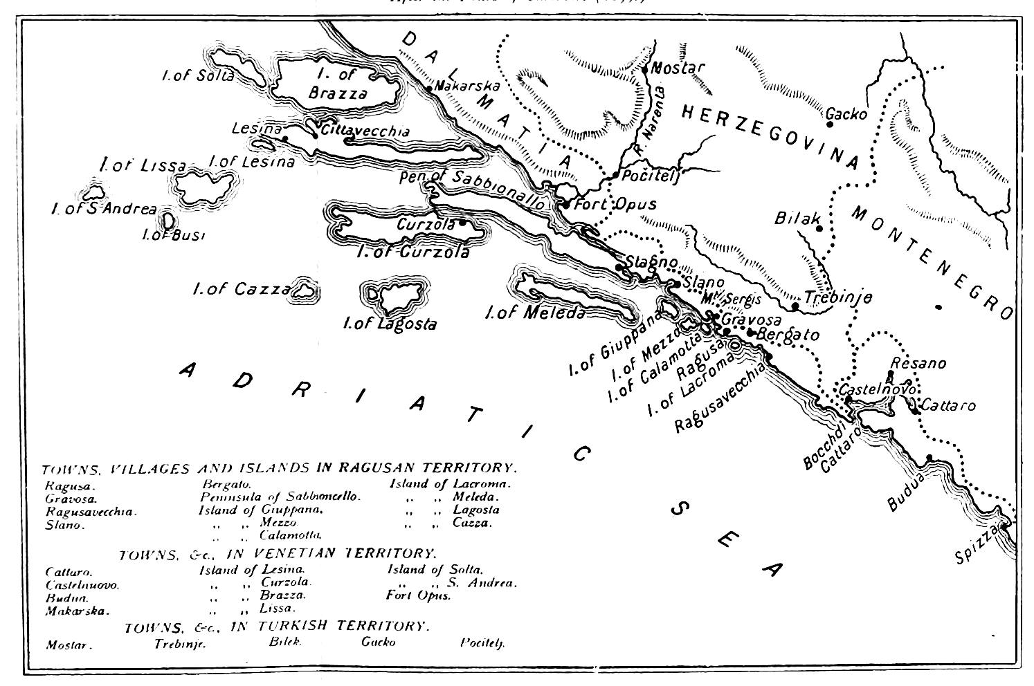 I must express my especial indebtedness to Professor Gelcich for the assistance and encouragement which he afforded me in preparing this volume. I also received valuable aid from Signor V. Adamović, who kindly placed his library at my service during my stay at Ragusa; to Signor A. de Serragli, who gave much information on the topography and archeology of the town; to the Padre Bibliotecario of the Franciscan Monastery, who assisted me in my researches; and tovii Signor Giovanni Saraca. I may say that during my visits to Dalmatia I always found the natives courteous and kindly, and willing to assist me in every way, especially at Ragusa. Of the many features which Dalmatia has in common with Italy, the one which I must call attention to is the fact that in every Dalmatian town there is always at least one local antiquary who has made a life-study of the history and archeology, working with no other thought than the love of the subject, and always willing to assist other students.