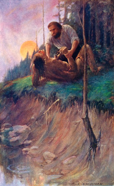 The struggle was now renewed with vigor. The Indian, moved to frenzy by fear, put forth such strength that for a space of time Smith was powerless to withstand him. Nearby was a stream and towards this the Indian dragged our hero, doubtless with the hope of getting into deep water where his much greater height would have given him an advantage. As they neared the bank, Smith contrived to get his foot between the other’s legs and trip him. The Paspahegh loosed his hold and stumbled forward for a pace or two. He quickly recovered and faced about to receive a stinging blow on the chin, and as he reeled under it Smith sprang at his throat and got it in a tight grasp. It was in vain that the Indian struggled to shake off that iron grip. Smith’s clutch did not relax until the savage exhausted and breathless sank to the ground.
