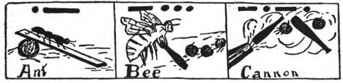 A in this picture is represented by an ANT. The dot is represented by an ORANGE on which the PLANK is resting, the plank represents the dash. Down the plank walks the Ant. See the picture and the motion of the Ant walking on the plank. See all pictures large in size and in motion. To close your eyes will help you to see the picture clearly. In each case make a large Moving Cartoon of the objects. Review by seeing the same picture each time.