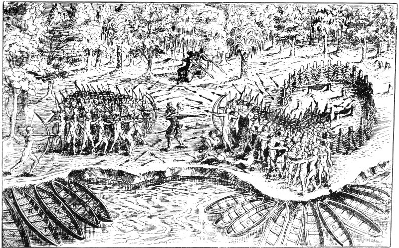 “Our party, likewise, kept their canoes arranged the one alongside the other, tied to poles so as not to run adrift, in order to fight all together should need be. We were on the water about an arrow-shot from their barricades.