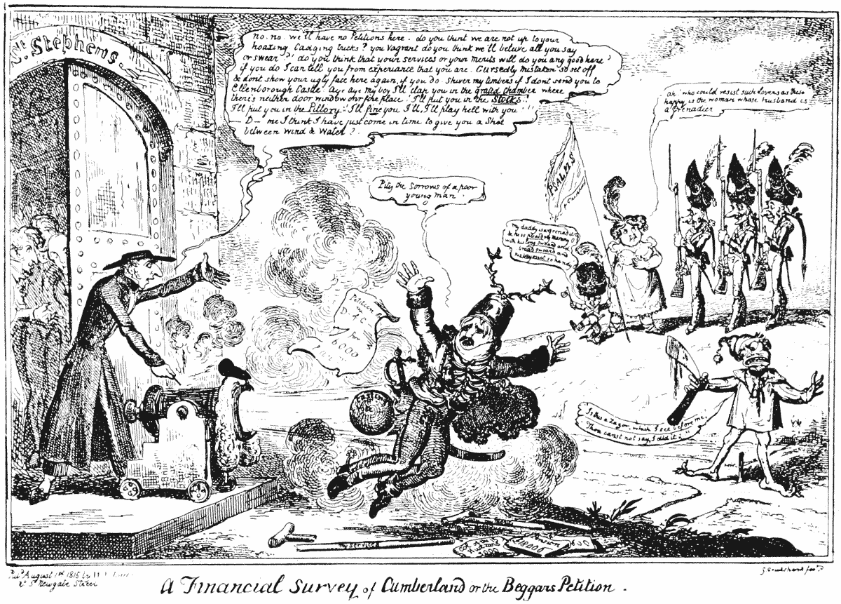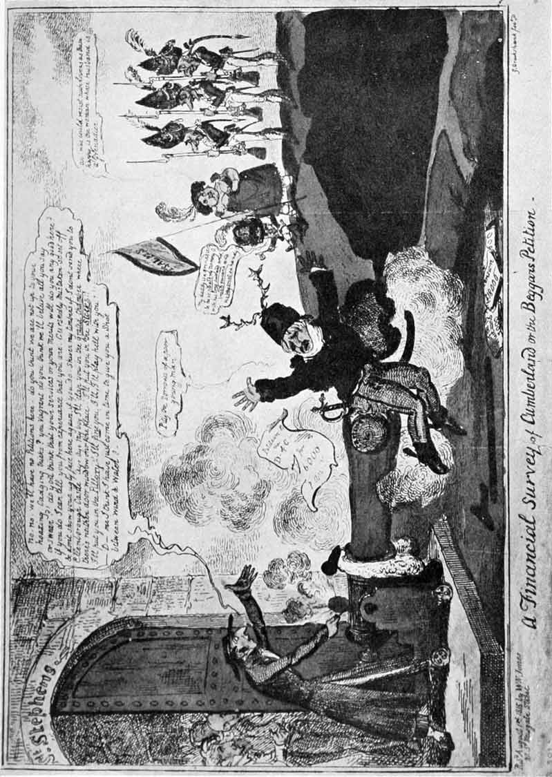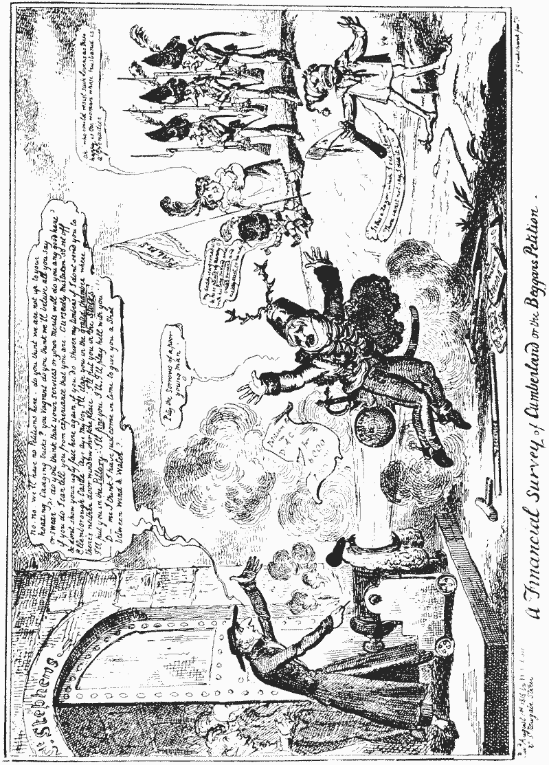 “A Financial Survey of Cumberland or the Beggar’s Petition.” (From the only known uncoloured impression of the plate) ▶ … Between pages 64 and 65
