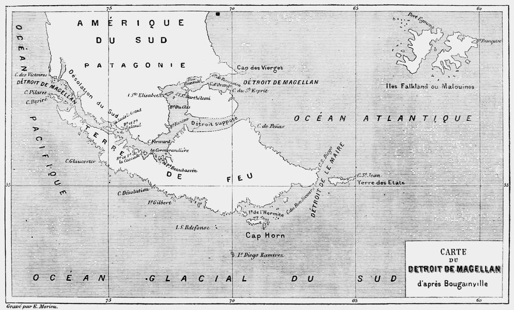 Après avoir dépassé cet archipel, les deux bâtiments piquèrent droit au sud, et s’enfoncèrent dans cette direction jusqu’à 60° 58′ de latitude. Il n’y avait pas de nuit, le froid était vif, et la mer si grosse, que la Duchesse fit quelques avaries. Les principaux officiers des deux bâtiments, assemblés en conseil, jugèrent alors qu’il n’était pas à propos de s’avancer plus au sud, et route fut faite à l’ouest. Le 15 janvier 1709, on constata qu’on avait doublé le cap Horn, et qu’on était entré dans la mer du Sud.