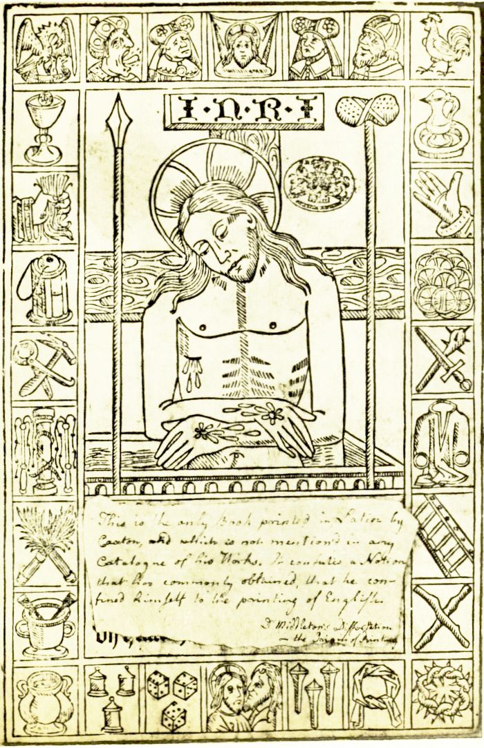 The last five books printed by Caxton are theological or liturgical. The Ars Moriendi, a unique little quarto of eight leaves, was discovered in a volume of early tracts in the Bodleian by Henry [pg 78] Bradshaw, and is described by Blades in the second edition of his book. He there states that no other edition in any language is known; but it was certainly reprinted by Wynkyn de Worde. The Fifteen Oes, a little quarto containing fifteen prayers, each commencing with O, is known from a unique copy in the British Museum. The book was no doubt intended as a supplement to the Sarum Book of Hours, but no edition agreeing with it typographically is known. It differs from all other of Caxton's books in having wood-cut borders round each page of text. It also contains a beautiful wood-cut of the Crucifixion, one of a series intended for a Book of Hours. No doubt Caxton possessed the set, and we find it later on in the hands of Wynkyn de Worde.