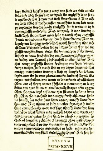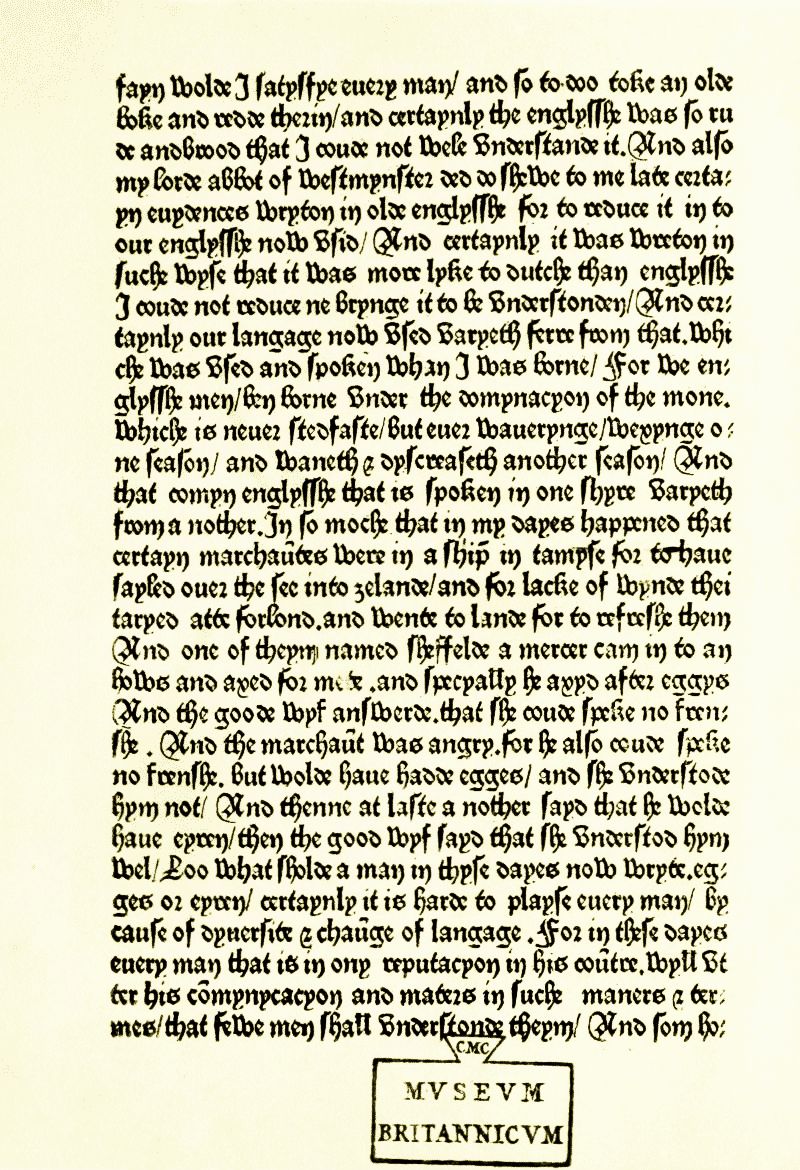 "Of your charitee pray for the soul of Mayster Wyllyam Caxton, that in hys time was a man of moche ornate and moche renommed wysdome and connyng, and decessed ful crystenly the yere of our Lord M.CCCC.Lxxxxj.