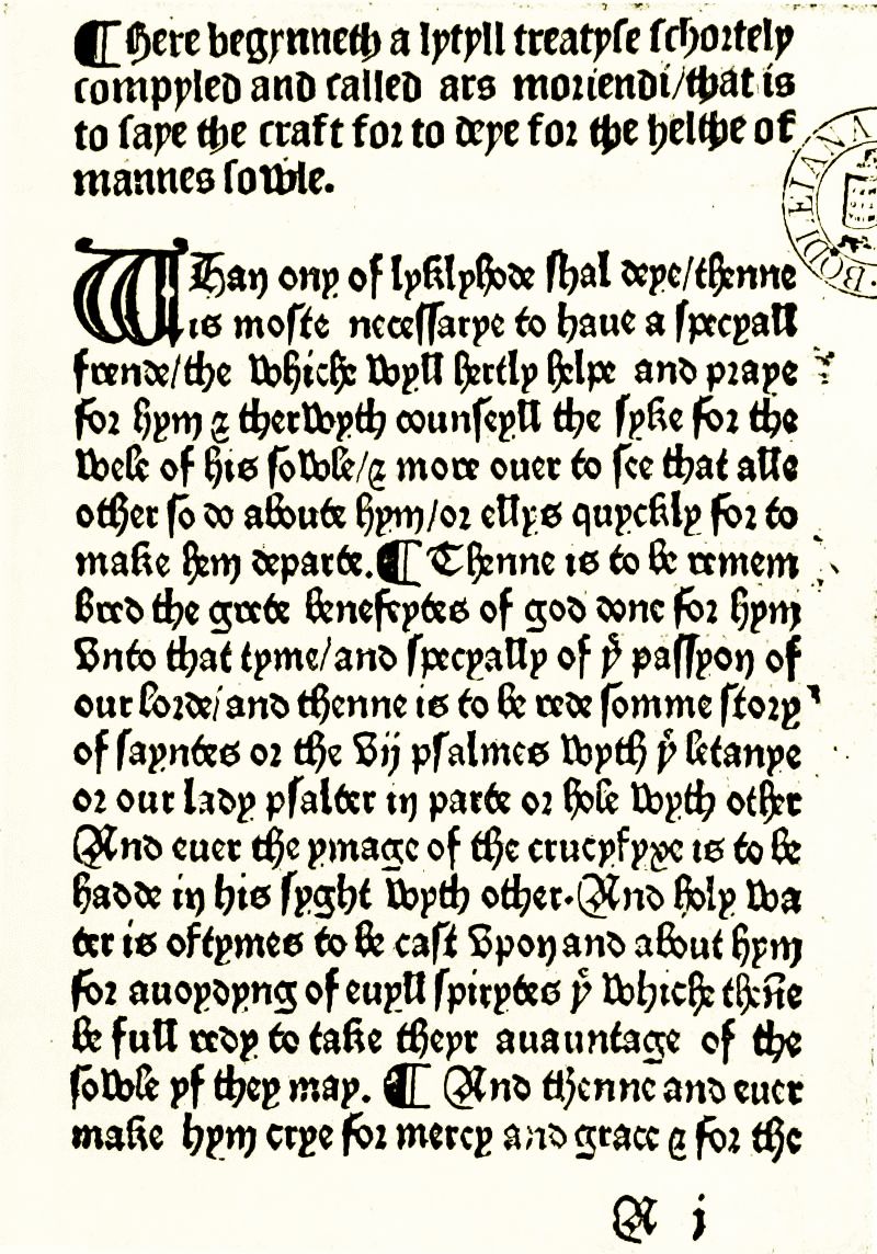 In June, 1490, Caxton finished the translation of two books, The Art and Craft to know well to die and the Eneydos. The first is not a translation of the complete book, but merely a small abridgment, running to thirteen printed leaves in folio. Blades mentions only three copies, and curiously enough makes no mention of the peculiarly fine one which belonged to Lord Spencer, though he made a careful examination of all the Caxtons at Althorp.
