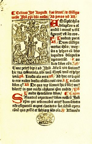 The Servitium de Transfiguratione Jesu Christi and the Commemoratio lamentationis Beatae Mariae Virginis are special issues of new services to be incorporated into the Breviary. The first contains 10 leaves, and is one of the very few books in which Caxton introduced printing in red. The only copy known, bound up with a unique tract printed by Pynson, and some foreign books, was formerly in the Congregational Library, London, but was purchased by the British Museum in 1862 for £200. The Commemoratio, a quarto of 34 leaves, is known only from the unique copy, wanting two leaves, presented to the University of Ghent by the learned librarian, Dr. Ferdinand Vander Haeghen. This little book was purchased for a trifle at a sale in Ghent and remained unrecognized for many years, until M. Campbell of The Hague identified it as a production of Caxton's press.